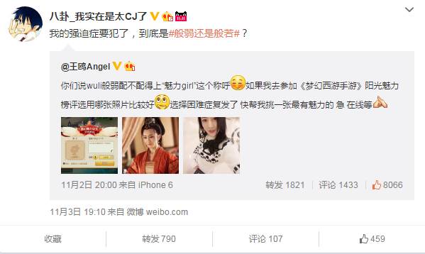 然而許多網(wǎng)友們的關(guān)注點(diǎn)也是迷人の醉,既不在她是夢(mèng)幻西游手游玩家也不在照片美不美更不在選哪張照片上!