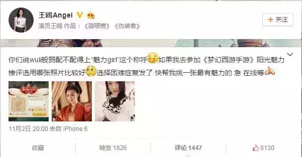 事情是這樣的,前幾天《瑯琊榜》秦般弱的扮演者王鷗發(fā)了一條微博,內容如下: