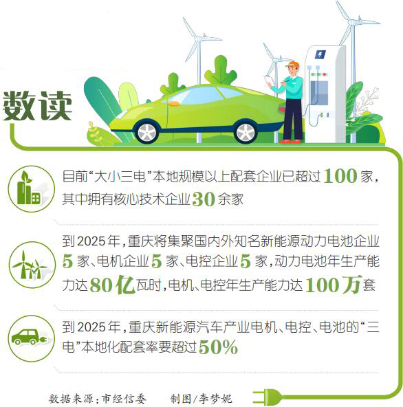 市經(jīng)信委相關(guān)人士介紹,近年來(lái),重慶在完善配套上大動(dòng)作頻繁,一大批“大小三電”(大三電指電機、電控、電池,小三電指DC/DC轉換器、車(chē)載充電機、高壓配電盒)項目接連上馬。無(wú)論是動(dòng)力、變速、制動(dòng)系統,還是轉向、車(chē)橋、內飾、空調系統等,都已形成相對完整的供應鏈。到2025年,重慶新能源汽車(chē)產(chǎn)業(yè)“三電”本地化配套率要超過(guò)50%。