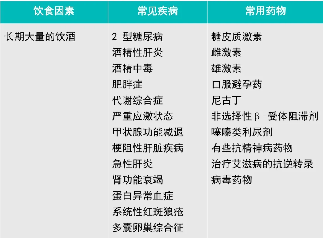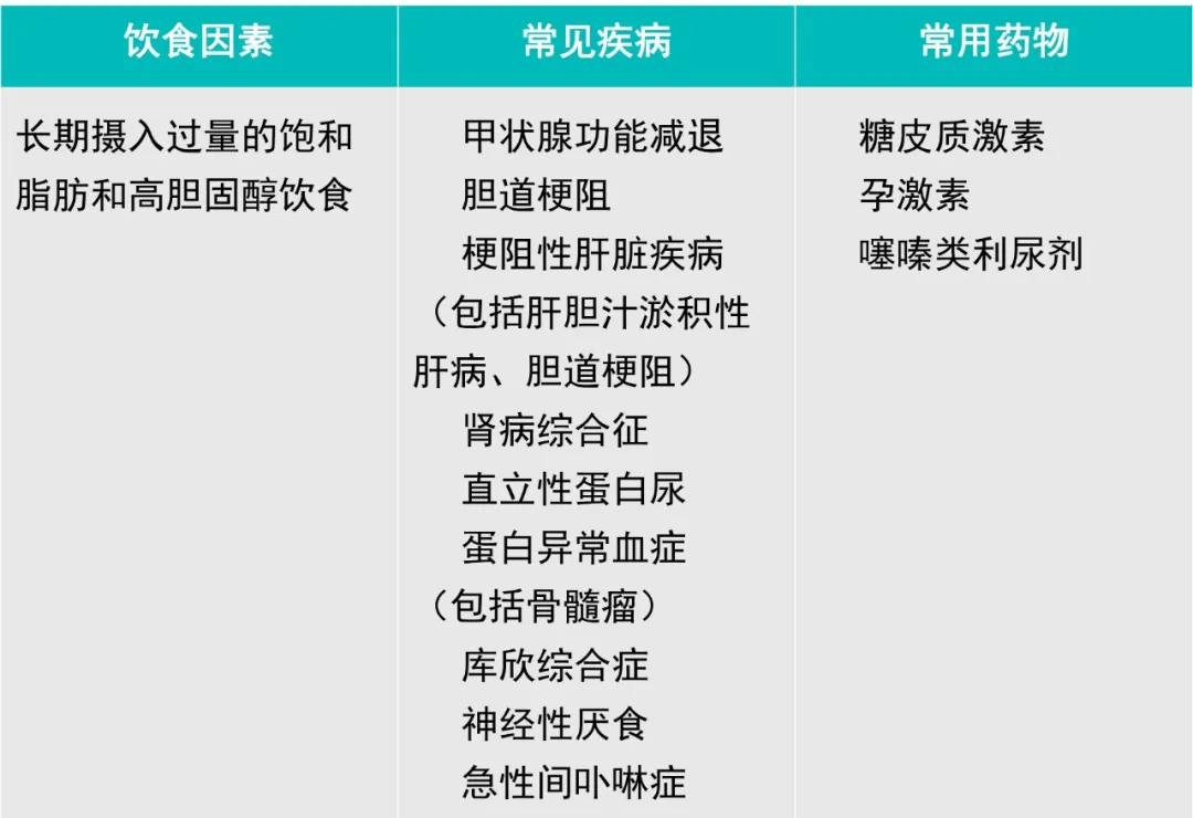 01. 按脂質(zhì)分類(lèi)更實(shí)用在目前臨床實(shí)踐中,常用的分類(lèi)為高膽固醇血脂、高甘油三脂血脂、混合性血脂異常和低高密度脂蛋白膽固醇血脂 (表 1)。事實(shí)上,在高脂血癥血漿中,一些脂蛋白脂質(zhì)含量升高,而另外脂蛋白脂質(zhì)含量可能降低。因此,有人認為將高脂血癥稱(chēng)為脂蛋白異常血癥更為合理。WHO 的分類(lèi)方法將脂蛋白異常血癥分為六型(表 2)。01:繼發(fā)性原因是大多數成人血脂異常的病因繼發(fā)性血脂異??蔀槿硇约膊∫?,也可由于應用某些藥物引起,在排除了繼發(fā)性血脂異常后才可診斷為原發(fā)性高脂血癥。繼發(fā)性高脂血癥常見(jiàn)病因見(jiàn)表 3、表 4。繼發(fā)性高甘油三脂血脂和或低密度脂蛋白血癥常見(jiàn)病因見(jiàn)表 3。繼發(fā)性高膽固醇血癥常見(jiàn)病因見(jiàn)表 4。表 3 繼發(fā)性高脂血癥常見(jiàn)病因表 4 繼發(fā)性高脂血癥常見(jiàn)病因家族性高膽固醇血癥:臨床特征主要為血清 LDL-C 明顯升高和早發(fā)冠心病,雜合子家族性高膽固醇血癥(HeFH)患者的 TC > 8.5 mmol/L (328 mg/dL),純合子家族性高膽固醇血癥(HoFH)的 TC > 13.5 mmol/L (521 mg/dL)。家族性混合型血脂異常:呈常染色體顯性遺傳,與脂蛋白酶缺陷和胰島素抵抗有關(guān)。表現為血漿膽固醇和甘油三酯水平升高及冠心病,高密度脂蛋白往往輕度降低,伴糖耐量減低、肥胖、高尿酸血癥等,無(wú)特征性黃色瘤。家族性高甘油三酯血癥:常染色體顯性遺傳。由于患者存在肝臟合成甘油三酯過(guò)多的代謝缺陷,使富含甘油三酯的大分子極低密度脂蛋白增多,患者多到成年才表現為持續性高甘油三酯血癥。20 歲以下者常無(wú)明顯異常。該疾病患者常合并肥胖、高血壓、高尿酸血癥、糖耐量異常、高胰島素血癥和動(dòng)脈粥樣硬化,易發(fā)生胰腺炎和疹狀黃色瘤。血漿甘油三酯升高,低密度脂蛋白和高密度脂蛋白水平降低。家族性異常 β-脂蛋白血癥:又稱(chēng) Ⅲ 型高脂蛋白血癥,是 ApoE 代謝異常的常染色體顯性遺傳疾病,以血漿膽固醇和低密度脂蛋白膽固醇明顯降低為特征。原發(fā)性高脂血癥的成人臨床診斷:符合下列標準中的 ≥ 2 條,1. 未經(jīng)治療者的 LDL-C ≥ 4.7 mmol/L;2. 皮膚/腱黃色瘤或脂性角膜弓;3. 雜合子家族性高膽固醇血癥(HeFH)患者常 > 40 歲(男性)或 50 歲(女性)患有心血管疾病。一級親屬中有 FH 或早發(fā) ASCVD 患者。原發(fā)性高脂血癥的兒童臨床診斷:未經(jīng)治療者 LDL-C ≥ 3.6 mmol/L 且一級親屬中有 FH 患者或早發(fā)冠心病患者;HoFH 患者多于幼年時(shí)期就發(fā)生嚴重的心血管疾病,其青年時(shí)期心血管疾病死亡率較 HeFH 患者增高 > 100 倍。不同 ASCVD 危險分層,不同 LDL?C 目標值