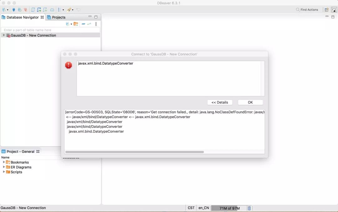 以下介紹在MAC OS下使用DbVisualizer圖形化工具連接高斯100 GaussDB T數據庫,解決Get connection failed., detail: java.lang.NoClassDefFoundError: javax/xml/bind/DatatypeConverter問(wèn)題。