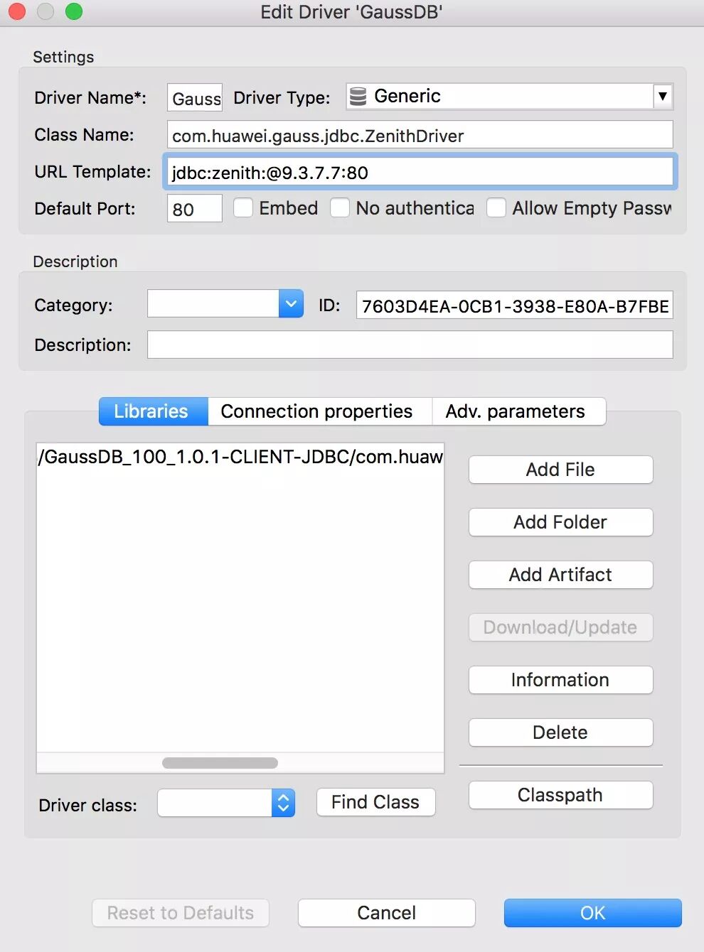 驅動(dòng)文件路徑:/gaussdb/GaussDB_100_1.0.1-REDHAT7.5-X86/GaussDB_100_1.0.1-CLIENT-JDBC/com.huawei.gauss.jdbc.ZenithDriver-GaussDB_100_1.0.1.SPC2.B003.jar