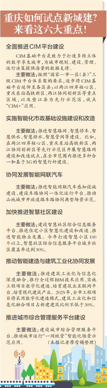 新城建是5G、大數據、云計算、區塊鏈等新基建技術(shù)在建設領(lǐng)域的廣泛運用。這些新城建“新”在哪里?將如何影響廣大市民的工作和生活?12月13日,重慶日報記者采訪(fǎng)了市住房城鄉建委相關(guān)負責人和專(zhuān)家,帶你從《試點(diǎn)方案》中發(fā)掘新機遇、新變化。