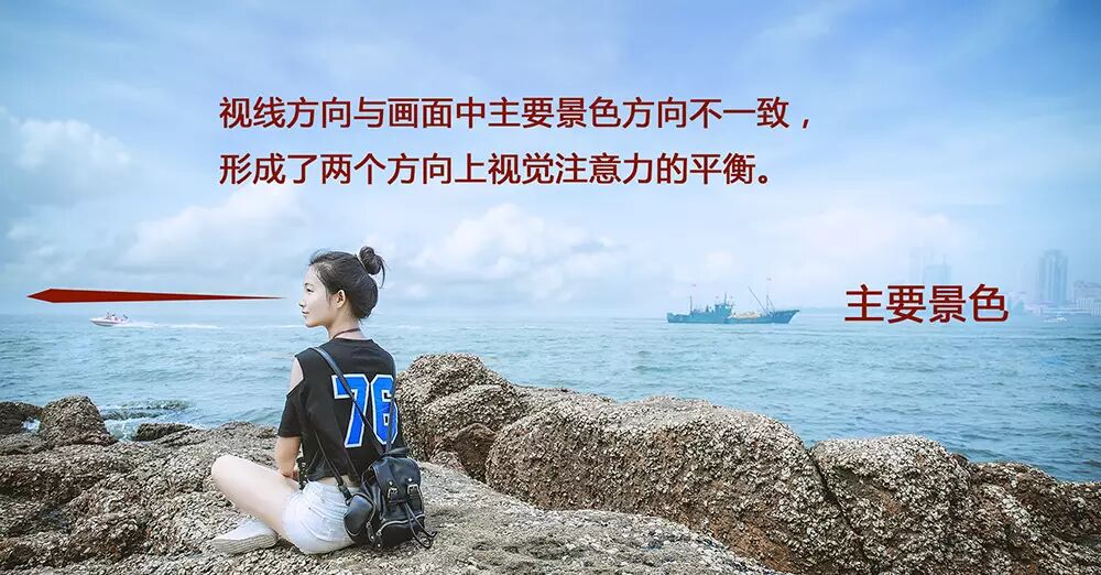 拍攝時(shí)注意人在景中的相對位置,上圖畫(huà)面中,我把人安排在畫(huà)面左側,人視線(xiàn)方向的延長(cháng)線(xiàn)和另一側畫(huà)面內海洋和城市遠景的內容形成平衡。如果讓人臉轉向右側,延長(cháng)線(xiàn)和畫(huà)面內容重疊,會(huì )加重視線(xiàn)延長(cháng)線(xiàn)方向畫(huà)面引人注目的程度,可能會(huì )顯得畫(huà)面失去平衡。