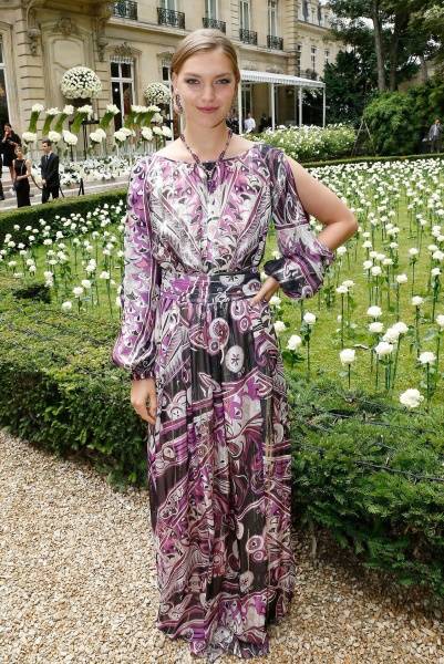 印花是田園風(fēng)格不可或缺的元素!Arizona Muse身穿Emilio Pucci印花連衣裙,印花樣式濃墨重彩,袖部有鏤空處理,巧妙平衡長(cháng)袖和及踝長(cháng)度的厚重感,同時(shí)配以清爽馬尾,兼備民族風(fēng)情和現代都市感的造型一蹴而就。