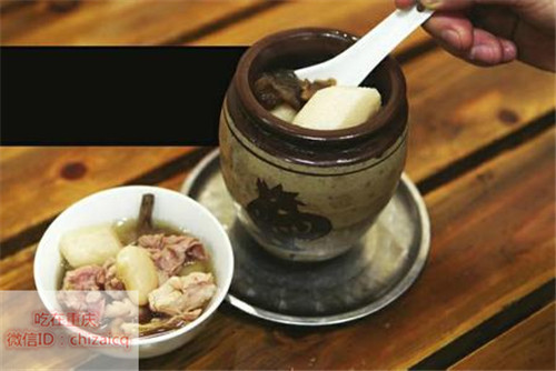 推薦理由:用本地土雞為原料,宰殺后剁成塊,配以大料、花椒、肉豆蔻、生姜等,與野生香菇和酸蘿卜在大鍋里燉煮后,連湯一起舀進(jìn)若干個(gè)陶罐(這種陶罐與土家族煨茶的黑色帶柄陶罐相似),再把陶罐放置爐火邊慢煨成菜。
