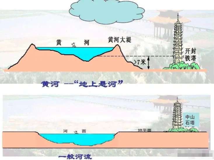 由于黃河在奔流的過(guò)程中攜帶了大量的泥沙,到了下游,黃河河水流速減緩,泥沙逐漸堆積。在部分下游區域,由泥沙堆積形成的河床,有些甚至已經(jīng)高出地面10米。
